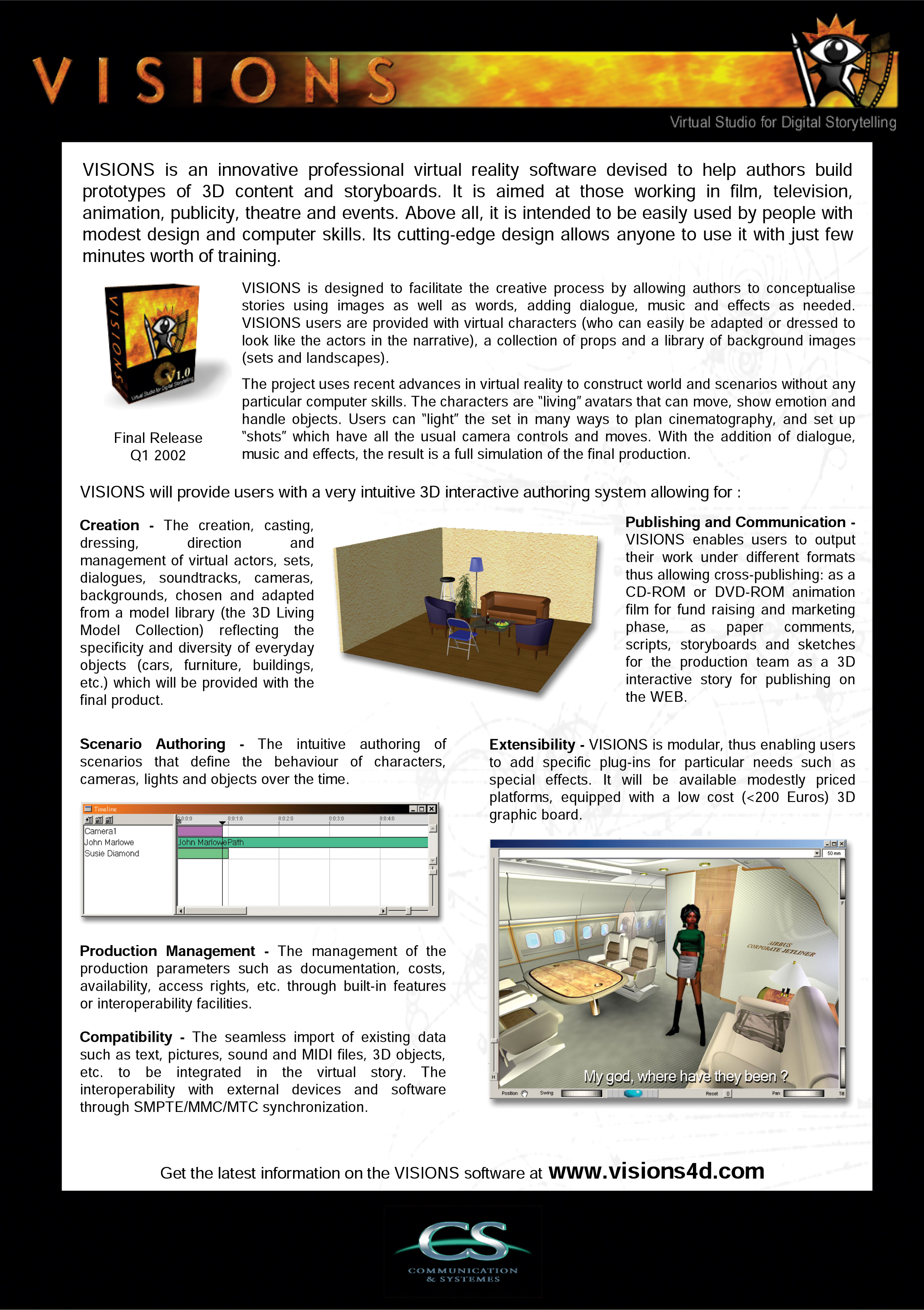 Balet O., Kafno P., Jordan F., & Polichroniadis T., First International Conference on Virtual Storytelling, Avignon, Published in SpringerLecture Notes in Computer Science, 2001.